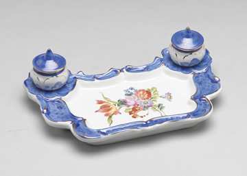 Blue and white porcelain with gold trim and hand painted floral design. Pots lift off the tray and lids are removable.