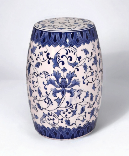 Blue and white transferware porcelain with flower, leaf and scrollwork design.