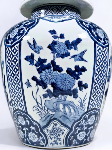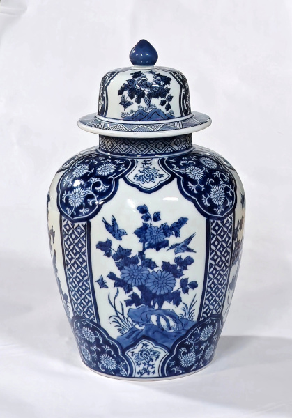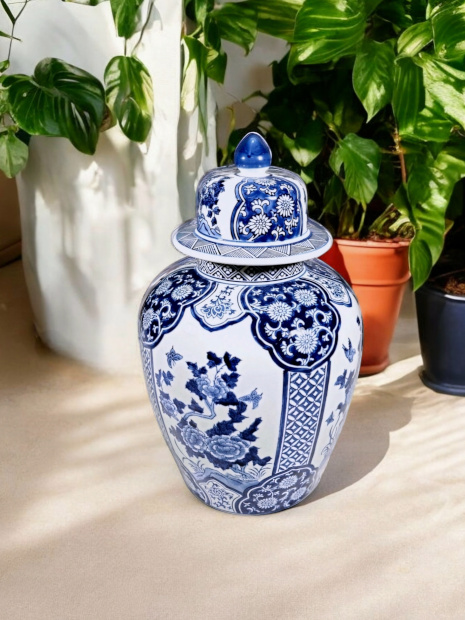 This classically shaped 17″ porcelain ginger jar will bring a touch of class to any room. Perfect by itself, in pairs or displayed with other porcelain pieces as a collection. Blue and white birds and flowers design.